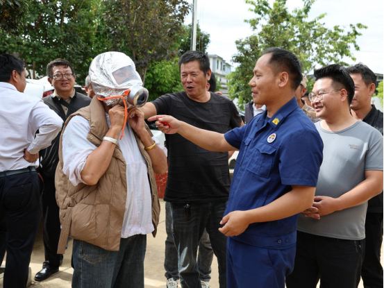 理论培训结束后,参训人员在消防员的指导下开展实操演练。演练内容包括灭火器材实操教学、手抬机动泵的示范使用、模拟火灾疏散逃生等环节。在实操教学中,消防员教学演示了灭火器和手抬机动泵的正确使用方法,还让现场人员参与其中,亲自穿戴消防战斗服和消防过滤式防毒面罩,并上手操作手抬机动泵,确保参训人员能熟练掌握器材使用方法和协作流程。紧急疏散模拟时,演练模拟某处楼房突发“火情”,微型消防站队员们迅速响应,组织现场村民捂住口鼻、低姿弯腰,沿预定疏散路线快速撤离至安全地带,切实提升群众在紧急情况下的自救互救能力。