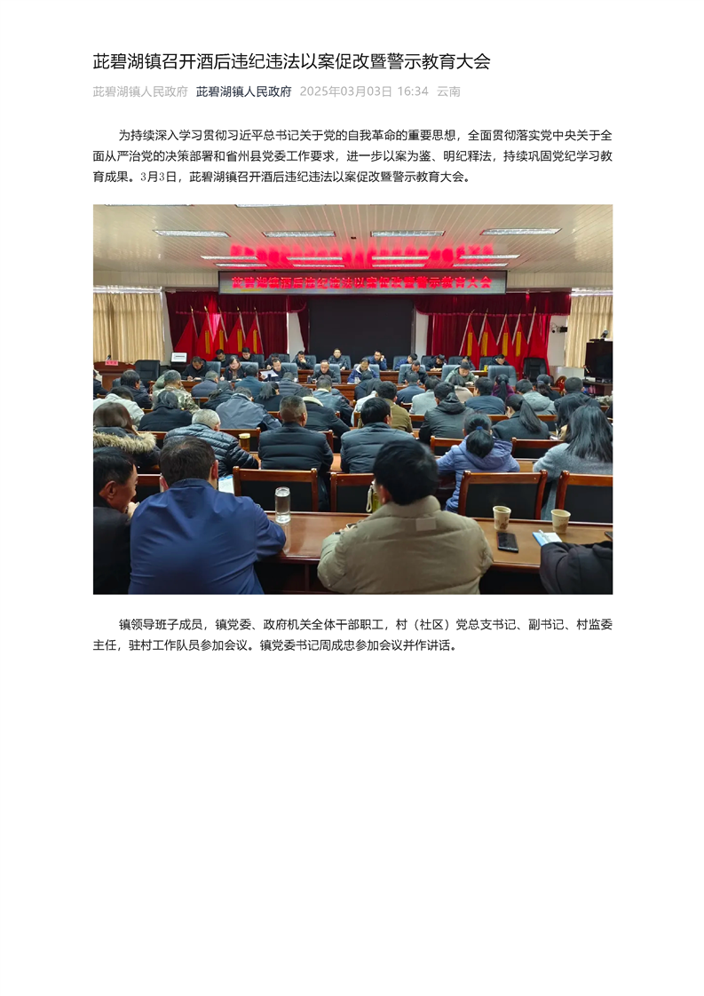 茈碧湖镇召开酒后违纪违法以案促改暨警示教育大会